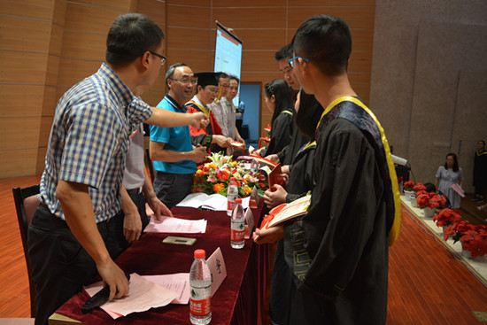 典礼开始,大家共同观看了专题片《2016届毕业汇报》,它记录了2016届毕业生的毕业感言,也记录了大家四年来的点点滴滴,此外,还有老师们对大家送上了祝福与期望。在观看完专题片后,魏延院长为拟取得学士学位证的毕业生授位并合影留恋,院长紧紧握住了每一位同学的双手,肯定了他们大学四年来的成绩。台上是院长的鼓励以及拿到学位证书的喜悦,台下则是同学们依依不舍之情。
