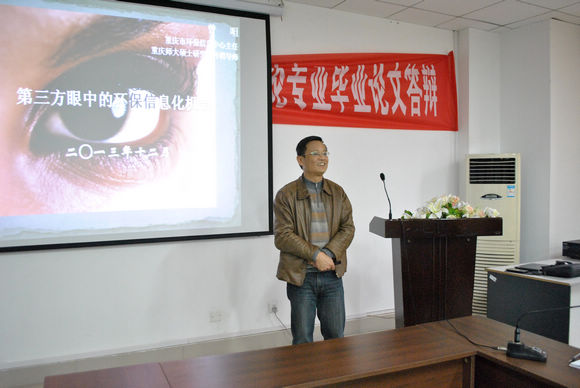曾喧主任首先对重庆市环保局信息中心基本情况进行了简要介绍。然后围绕建设环境质量监控预警系统和12369环境应急指挥系统,强化公众信息网建设,推动办公信息化和政务信息公开等方面,向学院师生介绍了中心加强环境保护信息工作的有关情况。最后,回答了师生提出的问题。他的精彩报告赢得了与会者的热烈掌声。