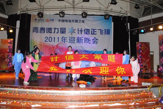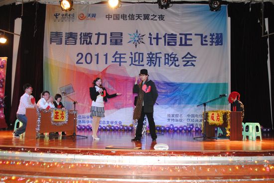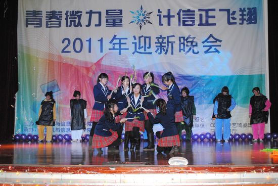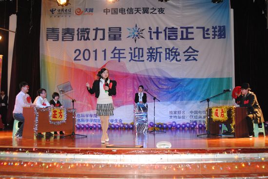 寒潮绕道去,热情洋溢来!伴着飘飞的彩带、亮丽的彩球,2011年12月11日晚上7:00,在同学们的欢呼与荧光棒的闪耀下,以“青春微力量,计信正飞翔”为主题的浪live 2011级迎新晚会于校学生活动中心拉开序幕。学院党总支书记刘军,院长马燕,副院长魏延、杨晓红,办公室主任罗世祥,团总支副书记张敬,以及全体辅导员、部分任课教师应邀出席,各兄弟学院的嘉宾代表和浪live 学子参加了整场迎新晚会。晚会由郑洪辉等五人主持。