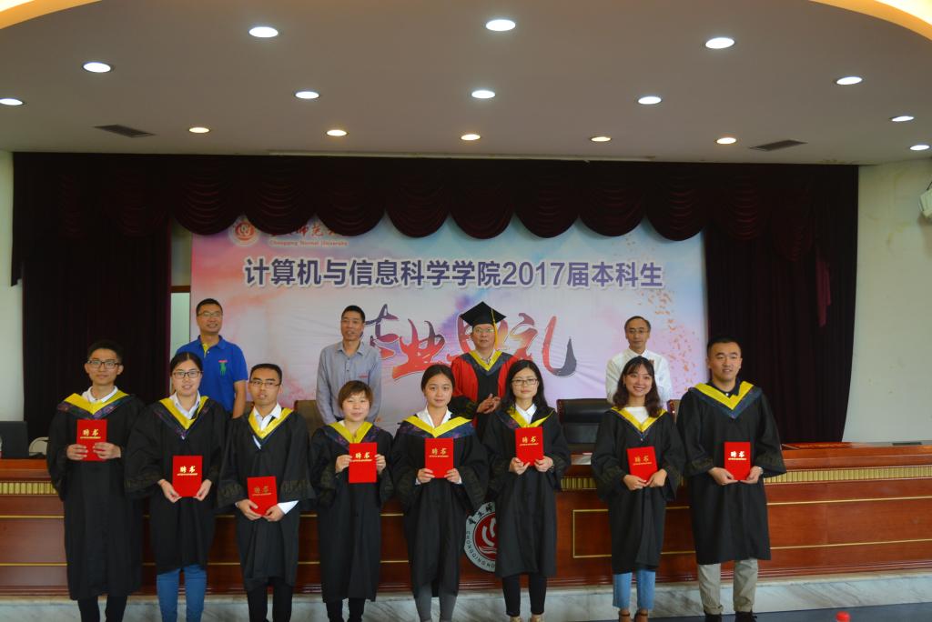 由本院学生制作的纪录片《2013,你好;2017不到离别》,回顾了2017届毕业生四年光阴。在授位仪式上,魏延院长为每一个获得学士学位的毕业生合影留恋,并握手拥抱。颁奖仪式上,李世宏副院长宣读了2017届优秀(优良)毕业生名单,并颁发证书。杨德刚副院长也为优秀考研者颁发奖励。学院还特聘了校友联络员,以维系2017届学子与母校情谊。接下来的毕业生代表雷童发言,一句“时光一去不回首,往事只能回味”,包含了毕业生对母校深切的感情与不舍。随后,冉瑞生老师作为教师代表发言,他勉励同学们继续努力,不忘初心坚持自己的梦想。最后刘军书记致辞,提出“出身社会,首先是做人,然后才是立业。你们大家永远是我的骄傲,希望你们再创辉煌!”
