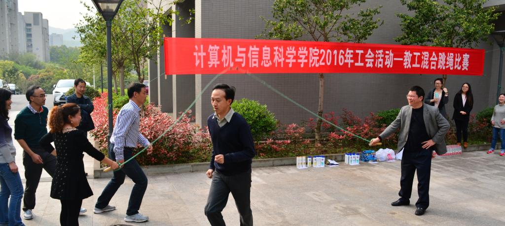 工会主办的计信2016年教工混合跳绳比赛在学院楼前开展。