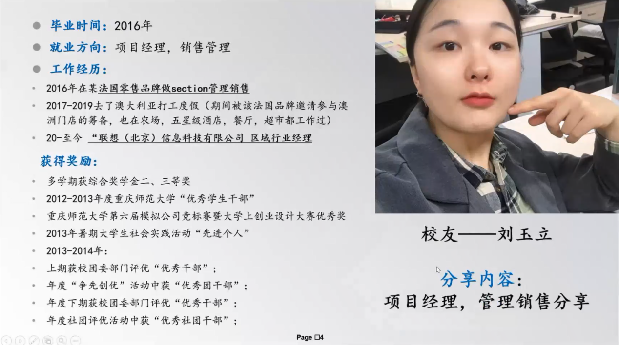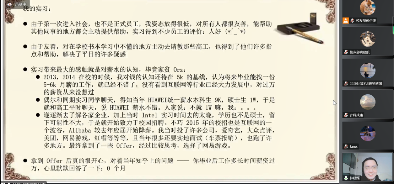 校友分会在线上开展成长“计”忆校友论坛,中国人民武装警察部队重庆市总队的优秀校友张浩男、联想(北京)信息技术有限公司大客户经理的优秀校友刘玉立和杭州巨量引擎网络技术有限公司的优秀校友王延峰参加此次宣讲会,他们分别从考公考编、跨专业就业以及IT本专业就业三个生涯发展类别进行职业生涯发展分享和就业指导。