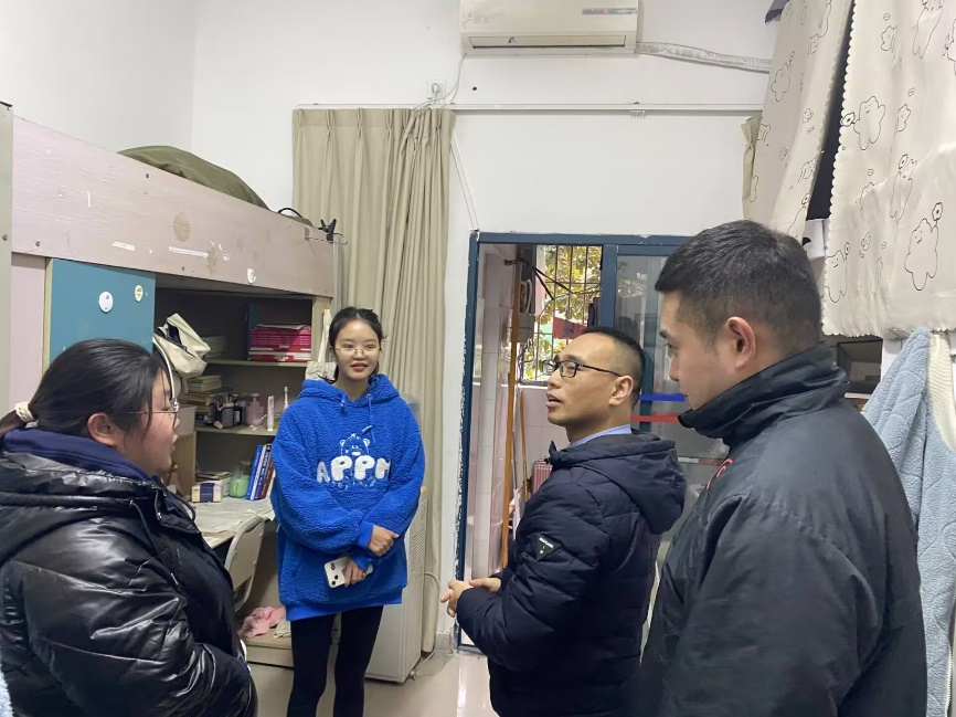 老师们心系学生学习生活的方方面面,李若岩与辅导员们深入园区进行安全检查,一一排查寝室有无安全隐患,提醒学生注意用电用气安全,重点进行了消防安全警示教育。同时详细了解留校学生的学习生活情况,帮助同学们解决困难,提醒同学们合理安排假期,并保持与家人的沟通,度过愉快的春节。