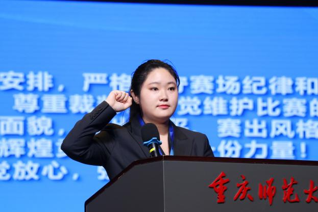 随后,重庆赛区负责人李明对大赛规则和纪律进行了详细说明,强调本次大赛将严格遵循公平、公正、公开的原则,确保比赛的顺利进行。评委代表帅青红教授郑重承诺将严格遵守评审规则,以严谨的态度、专业的水准,公正地对待每一位参赛选手,确保评审结果的客观公正。选手代表领誓,将践行竞技精神,遵守比赛规则。