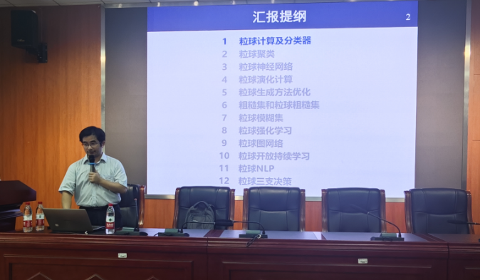 报告开始之前,崔院长代表学院对夏书银教授的到来表示热烈欢迎。崔院长详细介绍了夏教授近年来的科研成果、研究方向。夏书银教授是网络空间大数据智能计算教育部重点实验室副主任和前沿交叉研究院副院长。他在人工智能领域有着显著的成就,尤其是在粒球计算理论的研究和应用方面。他主持了多项国家重点研发计划项目和国家自然科学基金项目,并在IEEE TPAMI、TKDE、TNNLS、TCYB、ICML、ICDE等人工智能重要期刊和会议上发表了多篇论文。夏书银教授获得的荣誉包括国家优秀青年科学基金、重庆市杰出青年科学基金、重庆英才·青年拔尖人才等称号。他还获得了2021年吴文俊人工智能科技进步奖一等奖和国家教学成果二等奖。夏教授的研究领域涵盖了粒球计算、机器学习、深度学习、演化计算和群体智能等。他的研究成果不仅在理论上有所创新,而且在实际应用中也展现出了巨大的潜力,特别是在智能安全和医疗健康领域。