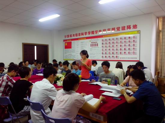 2013年5月中下旬,计信学院于集贤楼226办公室召开支部大会,会议讨论是否吸纳王智鹏、幸定军、孔妍君等同志为中共预备党员。大会应到正式党员19人,实到17人,符合支部大会既定要求。会议由学生党支部书记张敬老师主持。
