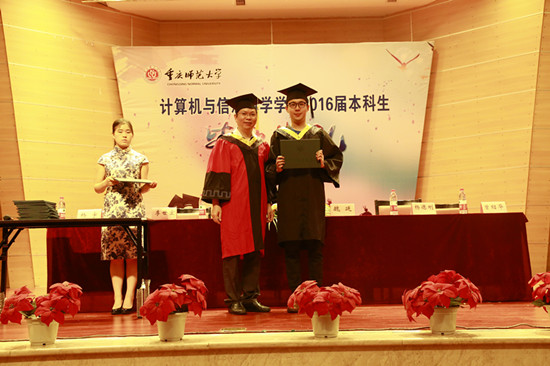 接下来,典礼进入表彰仪式。李世宏副院长为唐尚梅等27名优秀毕业生以及刘玉立等14名优良毕业生颁奖,其中张聪杰、张浩男、姚冠君、胡婕四名同学被推荐为重庆市优秀毕业生。紧接着杨德刚副院长宣读了给予第一志愿考取浪live