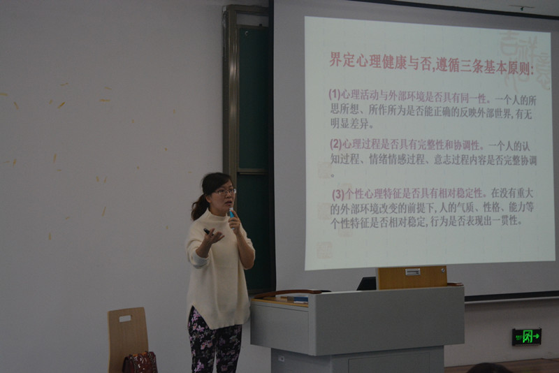 李老师注重强调了心理健康,提出了大学生心理健康包括正确的认知能力、和谐的人际关系、正确自我意识、健康的情绪体验且意志坚强可控、热爱生活并乐于学习生活、行为正常且人格完整和谐、正视现实并接受现实、生活情趣高尚等八条标准。同学们因此有了一个正确的参考方向。