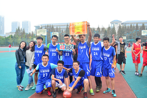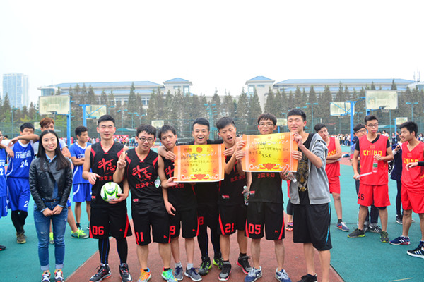 2015年11月9日,历时近一月的计信学院“迎新杯”篮球赛终于迎来了决赛。从10月12日开始,本次篮球赛共有21个班级参与,比赛开展20场次,最终,13级软外与14级计科、信管的球员们脱颖而出,争夺冠军的荣耀,14级软工同14级计师、软外争夺季军。计信学院团学生会主席雷童、副主席陈劲宇、体育部部长熊青青、文娱部部长刘玲、通讯部部长董怡冰,13、14级部分同学到场观看。