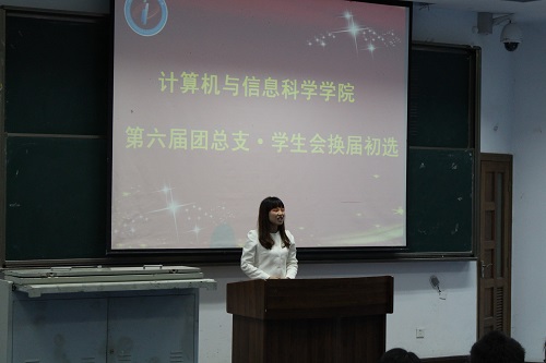 第五届团总支学生会团体学生干部,对新一届团总支学生会的成立表示期待。本次换届初选以个人演讲的形式开始,以评委投票的方式评分。在竞选过程中,各位优秀的竞选者们纷纷将奉献学院、服务集体、实现个人价值的追求展现出来。自信飞扬的演讲声中,展现的是同学们良好的自身素质和个人能力;落落大方的述职过程中,表达的是他们敢于承担责任期待为学院服务奉献的坚定信念。大会最后,朱嘉洁老师进行总结发言。她带领全体同学为第五届团总支学生会全体成员鼓掌,为他们一年来的工作和努力表示认可与感谢。同时,朱老师也寄希望于新一届的学生干部,希望新团队继续传承计信精神,为浪live