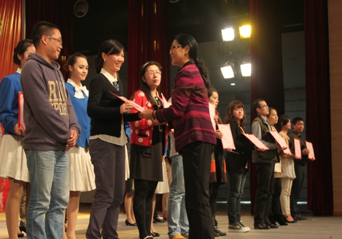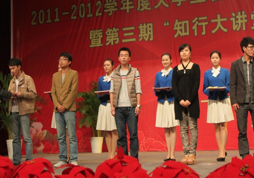 32名同学获得了“大学生社会实践先进个人”的荣誉,2012级汤泽鸿、潘文颖两位同学获得了“新生爱心志愿服务活动”的光荣称号,学校相关领导亲自颁发奖状,表彰大会在热烈的掌声中结束了。