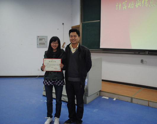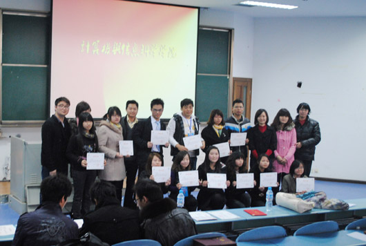 下午4:00,在一片热烈的掌声中大会正式拉开帷幕。首先,精彩的PPT播放激奋人心,让大家感受到作为计信人特有的骄傲。最期盼也最令人激动的颁奖环节紧随其后,张敬老师公布获奖名单后,老师们在激昂的乐曲声中为获奖者一一颁发荣誉证书。大会最后,张敬老师发表讲话,对2010年的工作进行了简要而中肯的总结:“苦”和“荣”并存。同时,他对2011年作出了展望与规划,并着重介绍了目前正在建设中的涵盖了计信e家人、学生动态信息管理以及静态信息管理三个部分的“学生管理系统”,旨在两年内形成计信学院“人人都是管理者”的理念,打造出自己的学生工作平台。