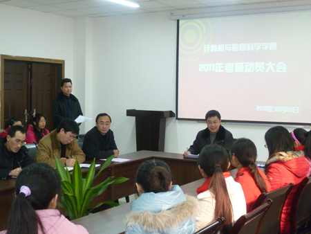 大会开始,马燕院长先跟同学们分享了考研的自身感受,强调信心的重要性,并就怎样科学复习做出了详细的讲解;而后魏延老师详细地讲解了志愿填报和补录的注意事项;接下来杨晓红副院长对考试时间和考试期间的注意事项进行了温馨提醒;随后,李晓燕书记以“信心比黄金重要”来鼓励同学们,希望大家一定不要半途而废;最后,刘军书记用“加强信心,鼓足干劲;科学准备,合理作息;放下包袱,轻装上阵;掌握技巧,把握机遇;一鼓作气,预祝成功”五句精炼的话对同学们提出了殷切希望。领导讲话结束后,07级计算机科学与技术专业的李爽同学代表所有考研学生向学院领导和老师做出承诺,一定严守考风考纪,以优异的成绩回报学院的关心。在大会的最后,浪live