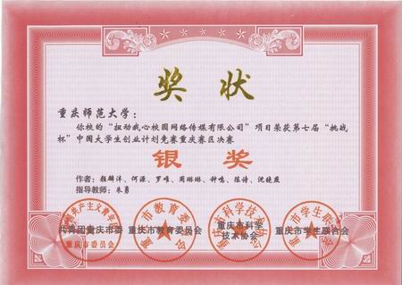 2007级计算机科学与技术专业罗唯、周琳琳与经管学院同学共同组队筹备的挑战杯项目“扭动我心校园网络传媒有限公司”获得重庆市银奖的好成绩。在此对指导两个项目的吴强、刘云杰老师以及同学们表示热烈地祝贺!对两位老师的辛勤付出表示衷心地感谢。