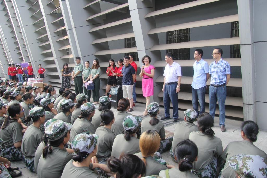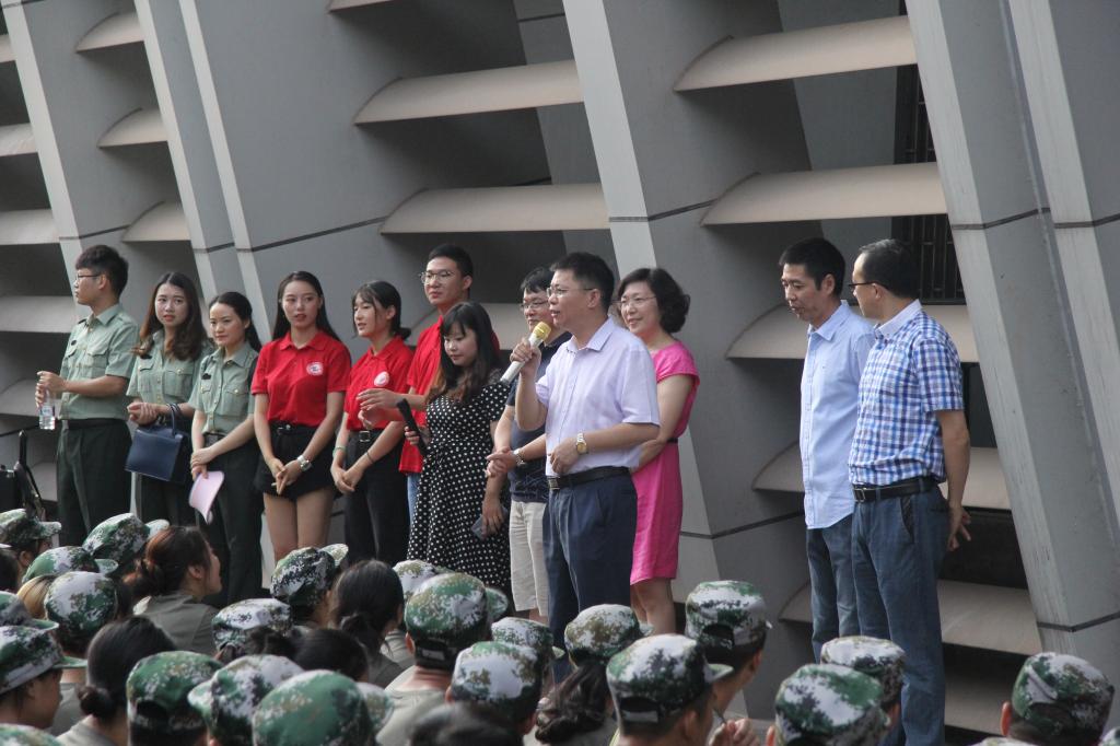 党委书记陈兰、院长魏延、党委副书记何东、副院长杨德刚、副院长李世宏、团总支书记钟华、16级辅导员刘宇、18级辅导员毛玲、团学会主席团及部分成员来到军训地对浪live