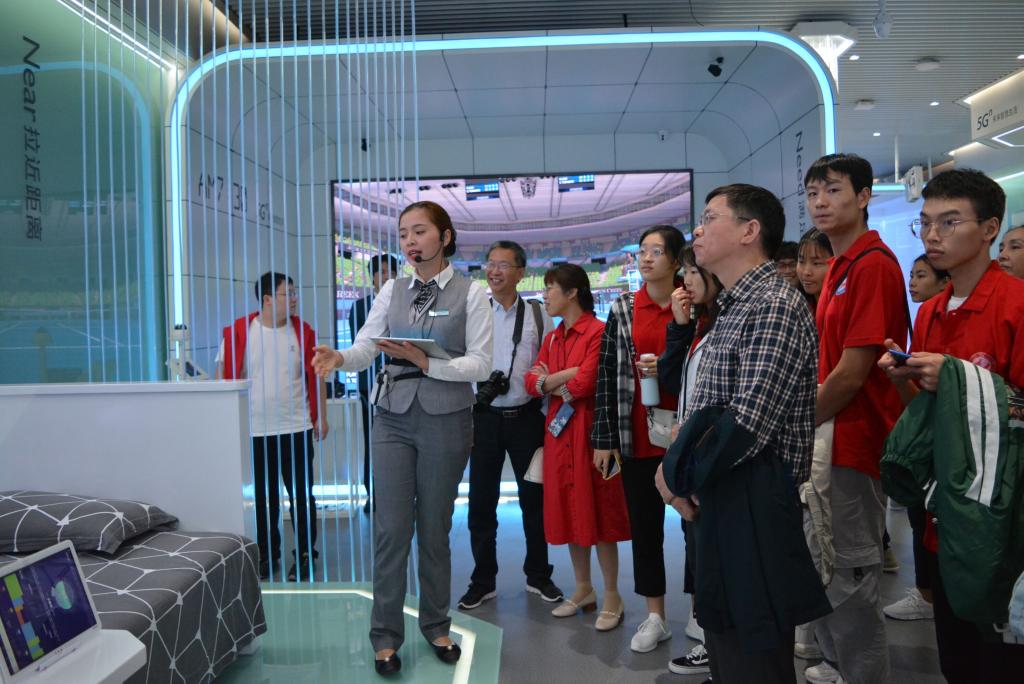 师生通过系统终端屏幕“刷脸”注册后,在参观体验园的同时,记录了运动的距离、消耗的热量等,并可以在终端屏幕上查询到这些数据及当日的运动排名。途中,讲解员向师生们介绍了沿途的智慧凉道体验区,体验区利用红外线和温度感应能自动进行喷雾降温,水雾从步道两侧喷出,形成了云雾缭绕的“人间仙境”。沿着智慧步道,师生们来到了5G智慧生活馆,相继体验了5G视频通话、VR虚拟驾驶、沉浸式自行车、机械臂打冰球、多人VR游戏、5G手机体验等互动项目,在体验的同时也感受到了5G给未来生活所带来的美好。