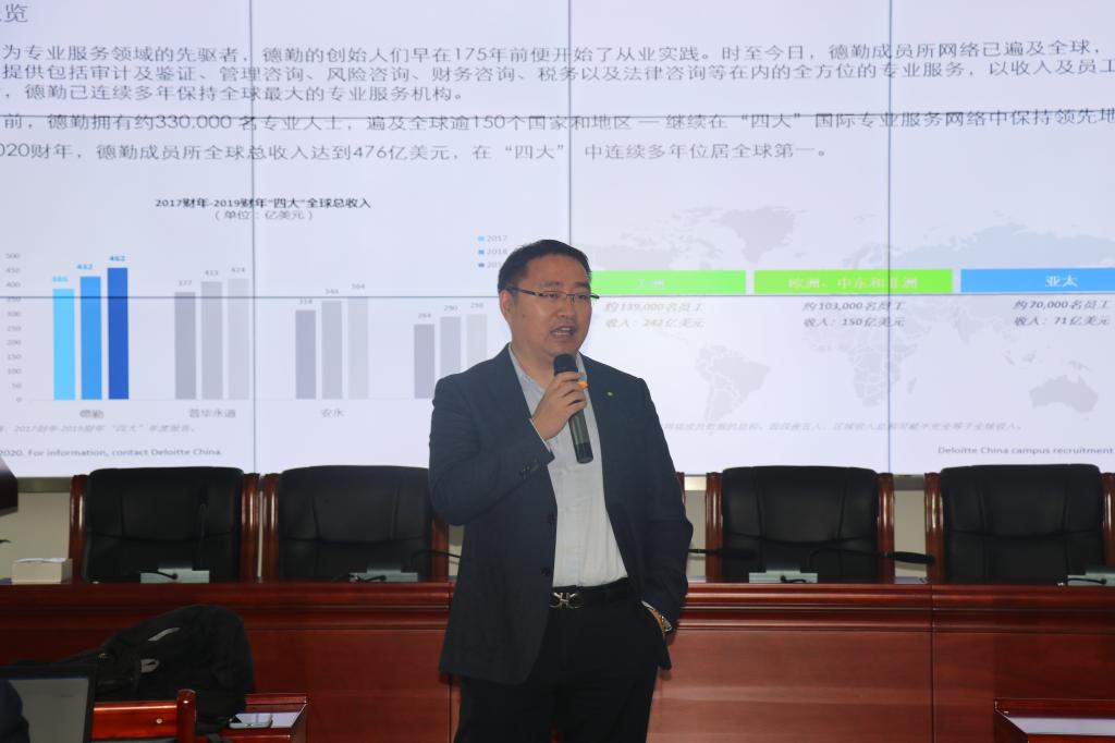 为促进2021届毕业生就业,深化校企合作,加深学生对企业的了解,德勤管理咨询全球交付中心招聘宣讲会于2020年10月15日15时在学院楼319室举行。宣讲会由德勤公司人力资源主任孙业鹏主持,17、18级学生参加。