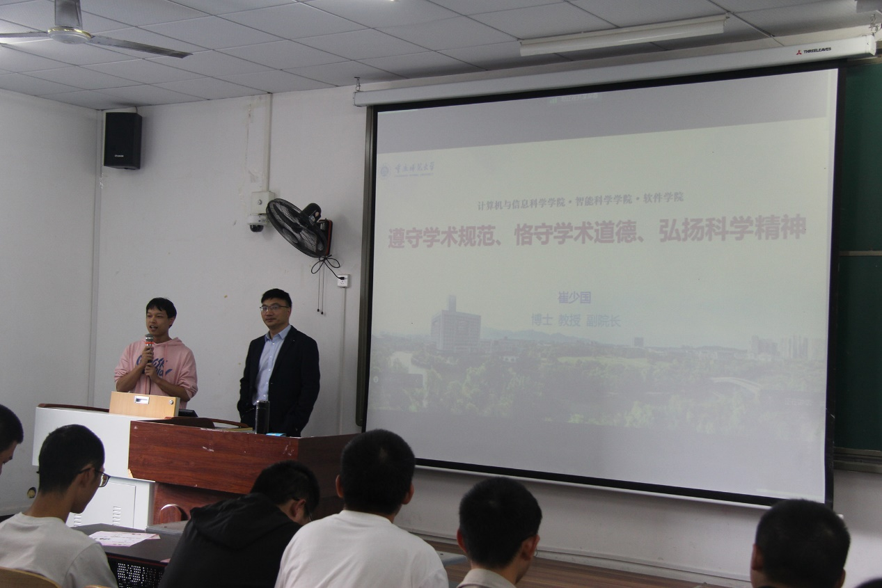 科研成果的形式及负责各研究方向的老师。在“学科竞赛”方面展示了各类竞赛、计信学院取得的荣誉和学院为选手们提供的学术环境。在重点强调“学术诚信”方面,通过详细的案例给新生们普及了学术不端行为的类型和国家对此行为严厉的处罚条律。