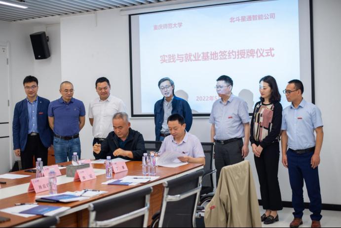 党委常委、纪委书记肖应红与北斗星通重庆分公司总经理李绍云签署了“实践与就业基地”协议并授牌。