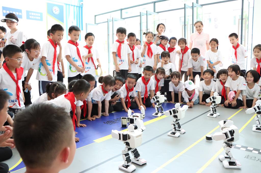 王军书记代表计信学院对附小师生表示热烈欢迎。观摩学习开始前,计信学院参会人员与附小师生一道在致用楼前合影留念。随后,小学生们欢呼雀跃、满怀好奇来到学院各试验基地。学院大厅中机器人闻令而动、翩翩起舞,整齐划一的跳着“科目三”,瞬间将全场氛围引燃,小学生们跟着手舞足蹈起来,被奇妙的人工智能设备和创新实验深深吸引。各实验室的负责老师分别为孩子们上了一堂精彩而实用的人工智能科普课,带领大家了解什么是人工智能,什么是机器人、人脑智能是怎样实现的、怎样训练人工智能、AI是怎样识别人脸和语言的、虚拟现实是什么样子的等一系列人工智能问题。同时,给小学生们讲解了全国机器人与人工智能大赛的综合技能挑战赛以及无人车自主驾驶的工作流程等信息。
